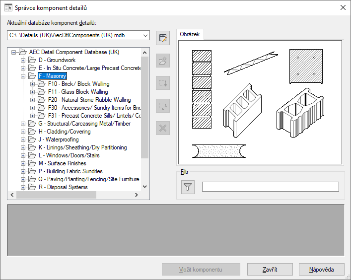 V dialogovém okně Správce komponent detailů můžete přejít do různých databází komponent detailů. Hierarchické stromové zobrazení a funkce filtrování usnadňují vyhledání jednotlivých komponent v rámci databáze. Vyhledanou komponentu, kterou potřebujete, můžete vložit do výkresu nebo ji můžete přetáhnout na paletu nástrojů, abyste ji mohli opakovaně použít. Poznámka: Pět tlačítek uspořádaných svisle uprostřed dialogového okna není k dispozici v případě, že nemáte k vybrané databázi oprávnění pro úpravy.