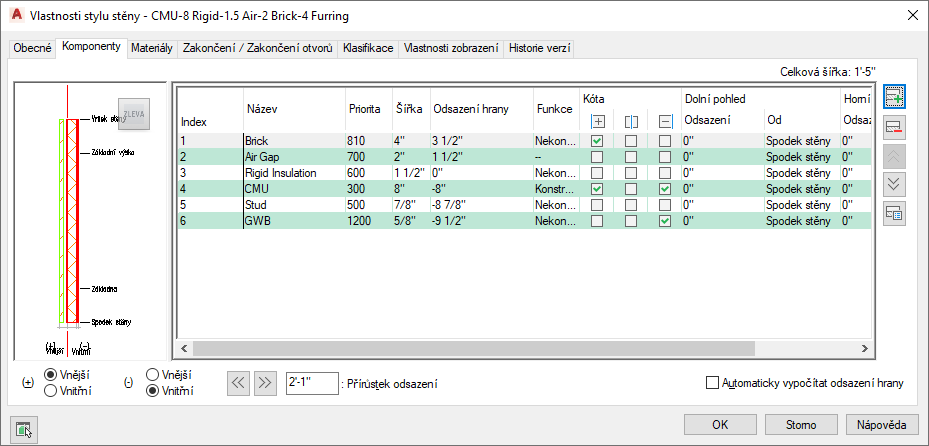 Každá komponenta ve stylu stěny odpovídá strukturální komponentě stěny nebo materiálu stěny, včetně vzduchových mezer v dutinových stěnách. Při vytváření komponenty stěny se zadávají tyto charakteristiky komponenty: