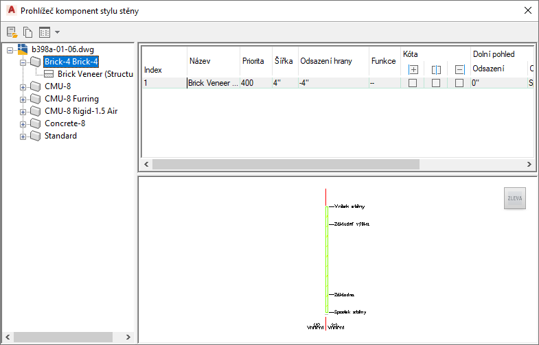 Prohlížeč komponentů stylu stěny je utilita, která umožňuje zobrazit a kopírovat komponenty ze stylů stěn v aktuálním výkresu a v jiných výkresech. Komponenty z těchto stylů je možné kopírovat do aktuálního stylu stěny. Po přidání komponent do stylu stěny je možné měnit jejich vlastnosti tak, jak vyžaduje styl, který právě upravujete.