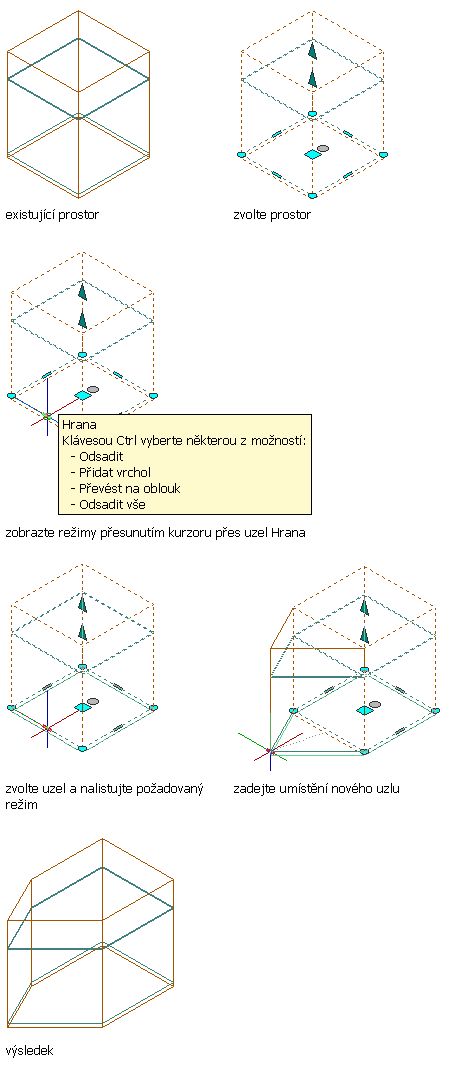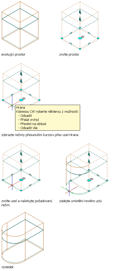 - Přidat vrchol: Tento režim úprav umožňuje přidat vrchol do vybrané hrany a vytvořit novou hranu. Pokud je vybraná hrana oblouk, bude nová hrana rovněž oblouk.
