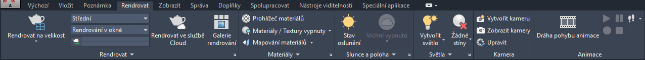 - Rendrování Obsahuje příkazy pro rendrování modelu nebo oblasti modelu, určení nastavení rendrování, generování rendrovaného výstupního souboru a otevření palety Rozšířená nastavení rendrování.