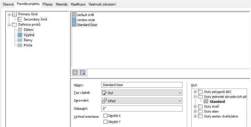 Styly obvodových plášťů. Zobrazen je seznam typů prvků.