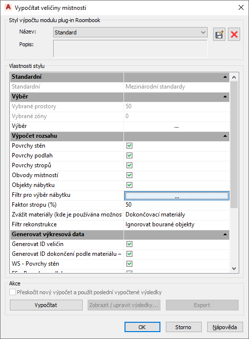 - Pokud jsou do výkresu přidány nové styly a definice až po provedení výpočtu veličin místnosti, tato možnost určuje, že tyto nové styly a definice budou automaticky zahrnuty do následujícího výpočtu. Ve výchozím nastavení je tato možnost zapnuta.