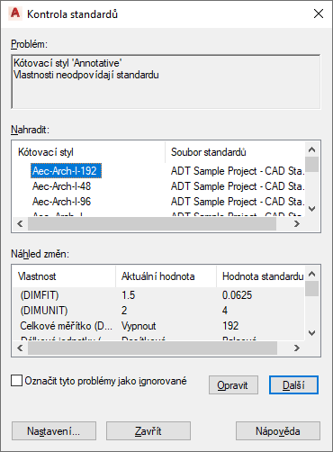 V nabídce Problém je uveden první kótovací styl, styl textu, hladina nebo styl typu čáry, který je neshodný s projektovými normami aplikace AutoCAD.