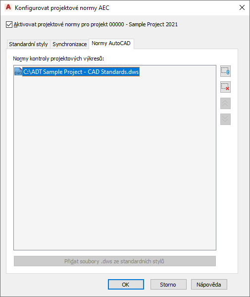 Použijte tento postup pro nastavení norem aplikace AutoCAD v projektu.