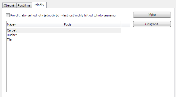 - Pokud chcete povolit, aby na paletě Vlastnosti byly zobrazeny jiné než zde zadané hodnoty, zaškrtněte políčko Povolit, aby se hodnoty jednotlivých vlastností mohly lišit od tohoto seznamu.
