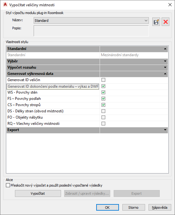 - V dialogu Vypočítat veličiny místnosti vyberte v části Vlastnosti stylu v seznamu Generovat data výkresu možnost Generovat ID konečné úpravy podle materiálu.