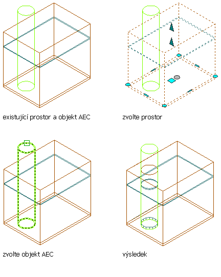 Pomocí tohoto postupu umístíte do prostoru objekty (například objemové prvky), které v prostoru vytvoří otvory nebo výřezy. Konstrukce sloupové osnovy může například obsahovat sloupy uvnitř prostoru. Jakmile jsou sloupy definovány jako kolizní podmínky, vyříznou plochu v podlaze a stropu prostoru.
