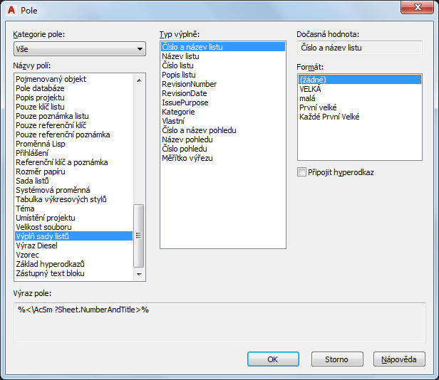 Tip: Kategorie Sada listů obsahuje pole pro pohledy a listy.