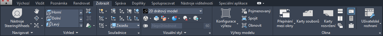 - Vzhled Na tomto místě lze vybrat předdefinované pohledy, vytvořit nové pohledy, otevřít Správce pohledů, vybrat vizuální styl, otevřít Správce vizuálních stylů a určit nastavení pro Procházení a průlet. Umožňuje přístup k předdefinovaným tématům zobrazení. Dále umožňuje úpravu rovin oříznutí a přístup k příkazům Regenerovat.