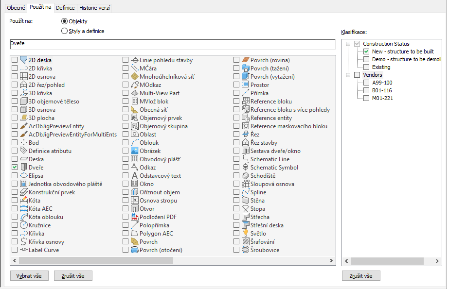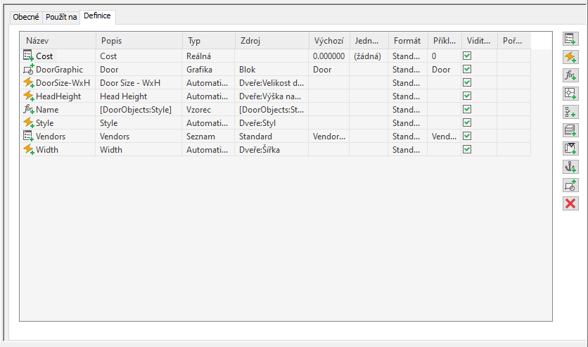 Definice sady vlastností použitá na objekty dveří