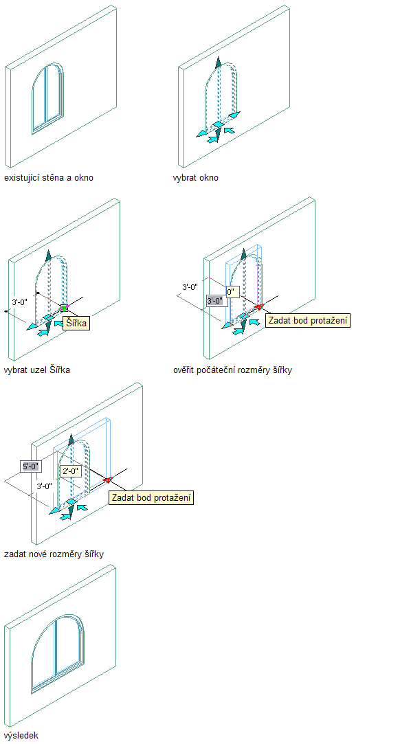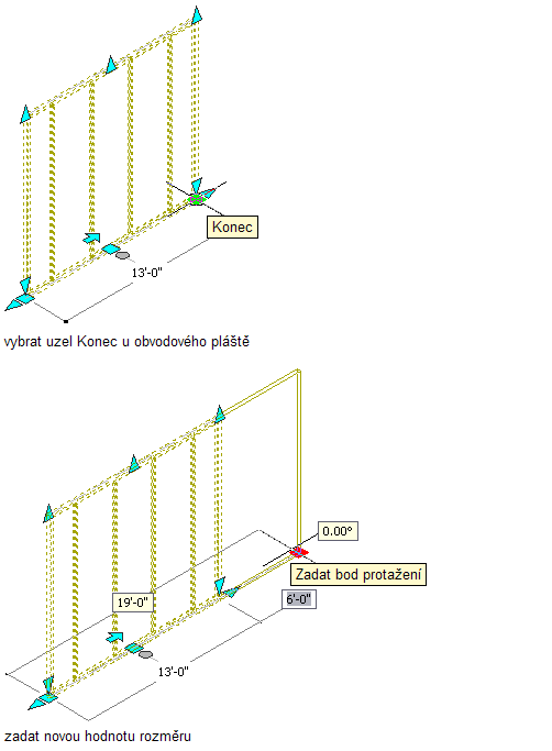 - Jestliže se zobrazí jedna nebo více kót s možností úprav, vždy je možné stiskem klávesy Tab přejít do stavu, kdy žádná kóta není v ohnisku a kdy je možné použít normální způsob zadávání na příkazový řádek. Tohoto stavu bez použití ohnisek je možné dosáhnout vždy stiskem kláves Shift+Tab ihned po výběru uzlu.