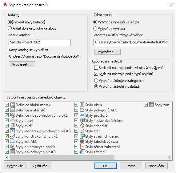 Poznámka: Pokud jsou povoleny obě možnosti, katalog je nejdříve seskupen podle výkresů, a poté podle typu objektu, přičemž kategorie budou generovány z výkresů a palety z typů objektů. Toto je implementováno, jelikož palety nemohou být vnořené. V tomto případě jsou vypnuta přepínací tlačítka pro kategorie a palety a pro katalog je vybrána možnost Vytvořit nástroje na paletách.