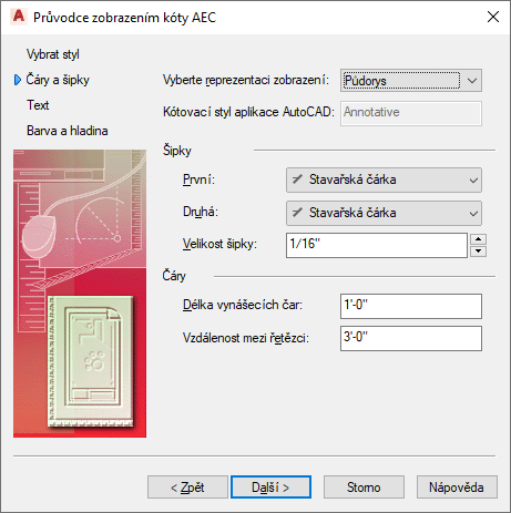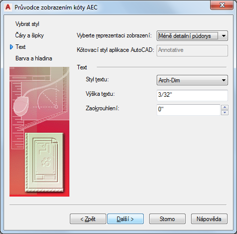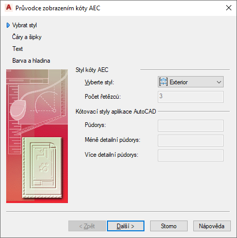 Vyberte kótovací styl AEC, který chcete upravit, a klikněte na tlačítko Další.