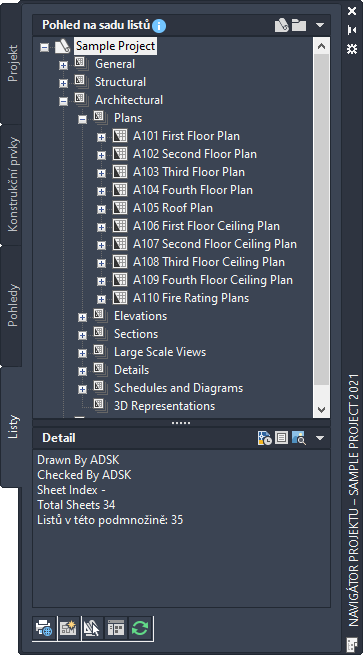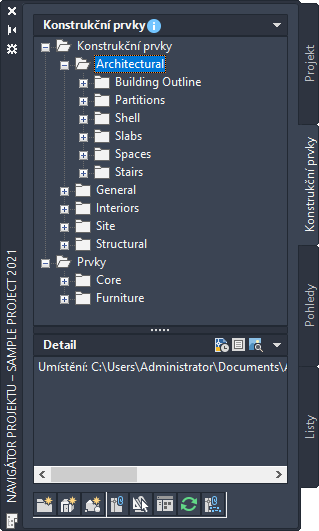 Základní kategorie jsou reprezentovány složkami v Prohlížeči výkresů v rámci struktury projektu, které pomáhají uspořádat projektové soubory podle oborů, typů výkresů nebo aspektů vašeho pracovního postupu.