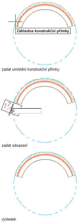 Kreslení konstrukční čáry s nulovým odsazením na základě segmentu obloukové stěny
