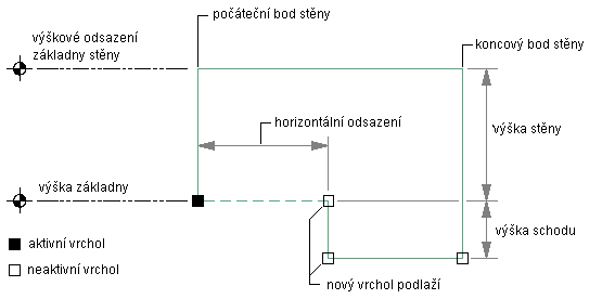 Tento postup slouží k přidání stupně k linii střechy nebo k linii podlahy stěny. Stupeň lze přidat také v tabulce Linie střechy/podlahy na paletě Vlastnosti.