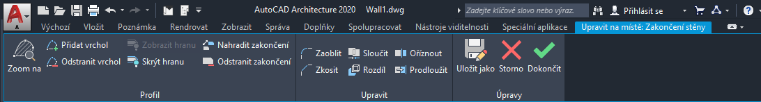 Režim úprav na místě představuje zvláštní editační režim, ve kterém lze přímo na obrazovce upravovat komponenty objektu založené na křivce nebo profilu, zatímco ostatní možnosti úprav ve výkresu jsou omezeny. Když se nacházíte v režimu úprav na místě, můžete například změnit zakončení stěny, ale nemáte možnost uložit a zavřít výkres. Po ukončení režimu úprav na místě můžete vybrat, zda se mají provedené změny zrušit, zda mají přepsat existující definici komponenty nebo zda mají být uloženy jako nová definice.