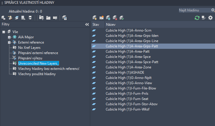 Když kliknete na odkaz, otevře se Správce vlastností hladiny a automaticky se vybere filtr Nesjednocené nové hladiny. Nové hladiny, které byly přidány do výkresu nebo do připojených externích referencí, jsou zobrazeny v seznamu.