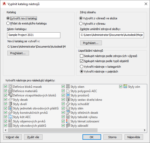 Tímto postupem je možné vytvořit nový katalog nástrojů založený na existujících standardech ze stylů jednoho nebo více výkresů.