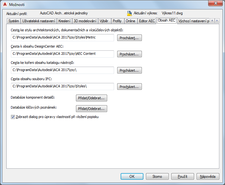 Tento postup slouží k určení výchozích možností obsahu AEC u aktuálního výkresu.