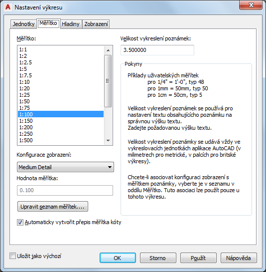 Zadání výchozích možností měřítka u aktuálního výkresu