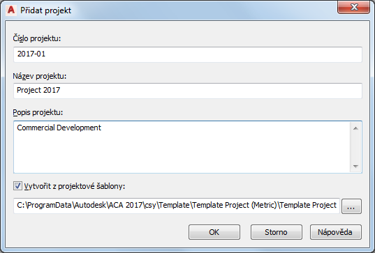 Tabulka s podrobnými informacemi o projektu, která je přístupná v dialogu Vlastnosti projektu, obsahují informace, na které lze odkazovat v rohových razítkách pomocí polí nebo je lze vkládat do atributů bloků nebo víceřádkového textu. Tato data jsou zcela definována uživatelem. Do detailů projektu v rámci projektu šablony začleňte data společná pro všechny vaše projekty.