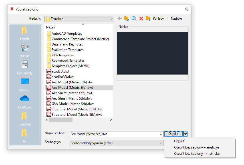 - Spusťte jej v čistém výkresu. Namísto použití příkazu RNový, který načte šablonu, použijte příkaz NOVÝ a zvolte možnost „Otevřít bez šablony – Britské“ v místním seznamu „Otevřít“.