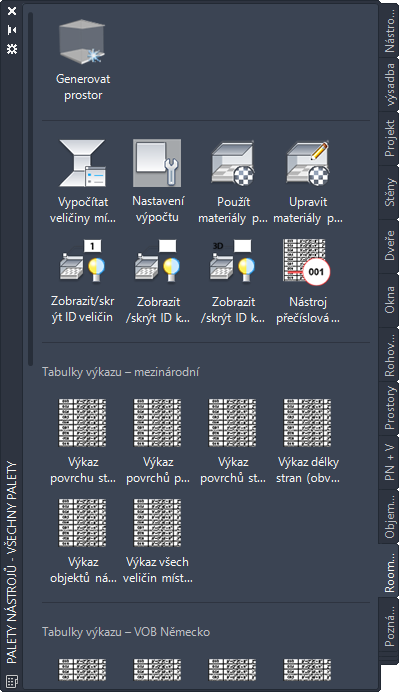 - ikony pro vložení tabulek výkazu pro různé veličiny místnosti (stěny, podlaha, plochy stropu, obvody a objekty nábytku) v závislosti na aktuálním standardu výpočtu,