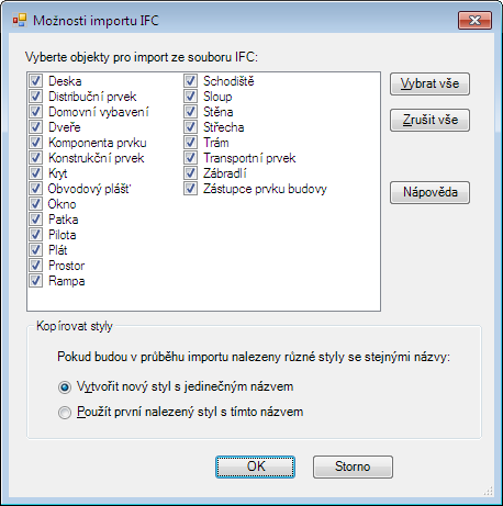 Při importu souboru IFC můžete určit objekty k importu: Chcete-li například ze souboru IFC vytvořit výkresový soubor zobrazující pouze obvodové pláště, můžete vymazat všechny ostatní objekty uvedené v dialogu Možnosti importu souboru IFC. Při prohlížení výkresu budou jedinými zahrnutými objekty ty, které jste vybrali.