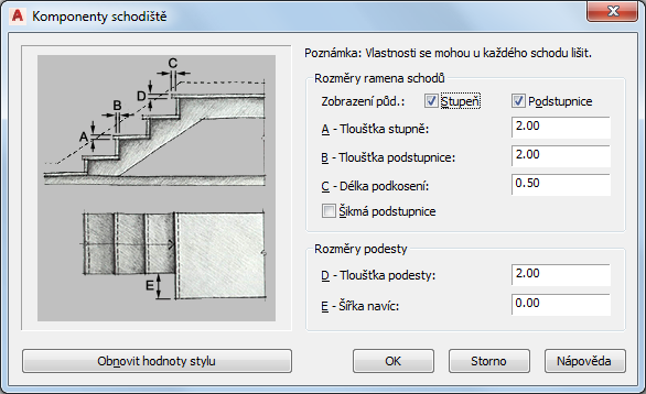 Tento postup použijte ke změně stupně, tloušťky podstupnice a délky podkosení pro každé schodiště. Můžete také zapnout nebo vypnout zobrazení stupně a podstupnice.