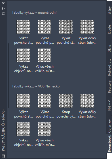 Paleta nástroje Roombook obsahuje různé tabulky výkazu podle toho, jaký je aktuální standard výpočtu. Příkazy jsou propojeny se souborem