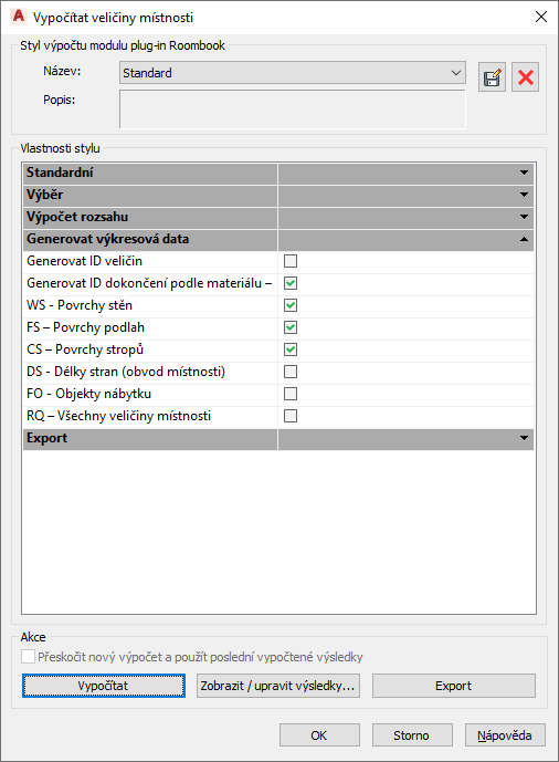 - V dialogu Vypočítat veličiny místnosti vyberte v části Vlastnosti stylu v seznamu Generovat data výkresu možnost Generovat ID konečné úpravy podle materiálu.