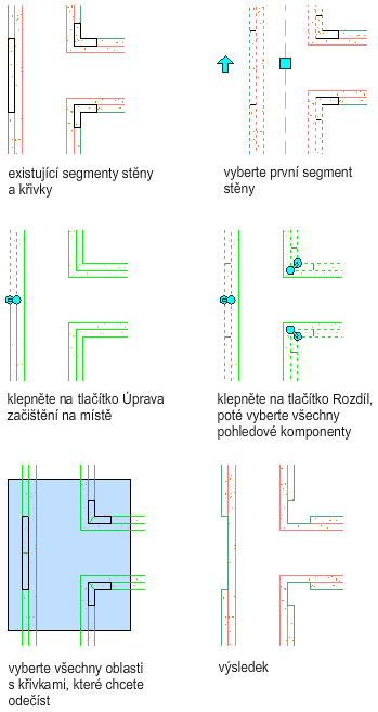 Tento postup slouží ke změně průsečíku stěny pomocí odečtení profilu z komponenty. Profil může být křivkou uzavřená plocha, která překrývá komponentu.