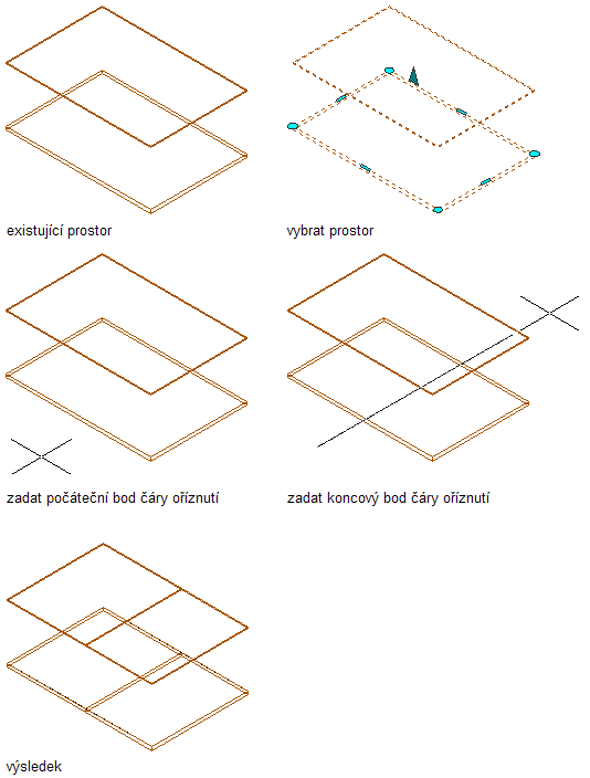 Tento postup se používá k rozdělení skici, polygonů AEC, vysunutí objemových prvků, prostorů nebo bloků, které obsahují libovolný z těchto objektů, do dvou (nebo více) částí definovaných dělicí čárou, kterou nakreslíte. Části na kterékoliv straně čáry lze potom volit samostatně. Je-li pomocí této funkce rozdělen do dvou částí objekt s uzavřenými hranicemi, obě části se vytvoří znovu jako objekty s uzavřenými hranicemi. Je-li otevřená křivka rozdělena klikatou čárou podél své délky, vytvoří se celá řada segmentů, které lze vybírat samostatně.