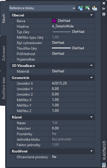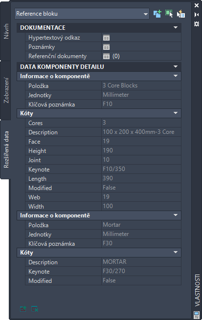 Následující obrázek ukazuje kartu Rozšířená data palety Vlastnosti pro blok detailu betonových tvárnic.