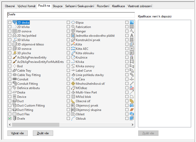V pravém podokně jsou uvedeny všechny definice klasifikací, které platí pro libovolný z vybraných typů objektů. U vícenásobných definic klasifikace můžete vybrat několik klasifikací. Při výběru klasifikací mohou tabulky výkazu tohoto stylu obsahovat objekty vybrané vlevo pouze v případě, že byly zařazeny do vybraných klasifikací.