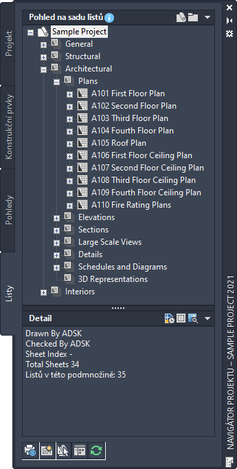 Sada listů projektu v Navigátoru projektu AutoCAD Architecture 2027 Toolset