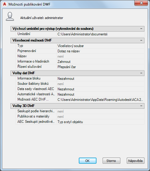 Publikovat. Jestliže není možnost <3D DWF> dostupná, nebyla pro výkres nastavena žádná platná konfigurace 3D zobrazení.