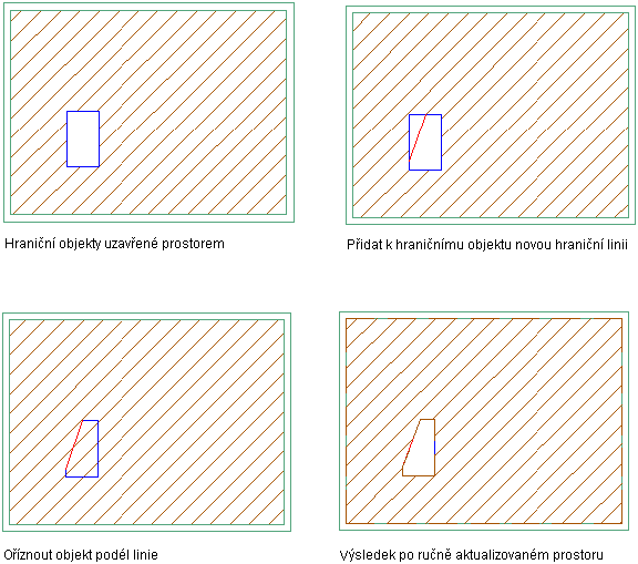 Při oříznutí objektu hranice nahrazením novým objektem hranice v poloze oříznutí nebude nový objekt automaticky rozpoznán jako hraniční objekt prostoru, protože dříve prostor neohraničoval. V takovém případě bude nutné prostor aktualizovat ručně, aby byl nový hraniční objekt rozpoznán. Viz následující příklad: