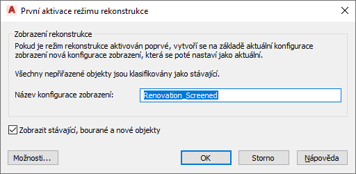 Zobrazí se dialog První aktivace režimu rekonstrukce a ve výchozím nastavení také název konfigurace zobrazení s předponou rekonstrukce.