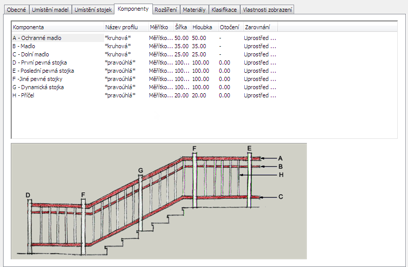 Tento postup slouží k zadání tvaru komponent zábradlí a šířky, hloubky a otočení jednotlivých komponent pro jednotlivé styly zábradlí.