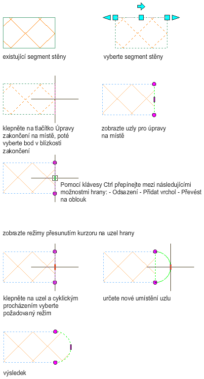 Tento postup slouží k převedení hrany komponenty stěny na oblouk pomocí uzlů Hrana.