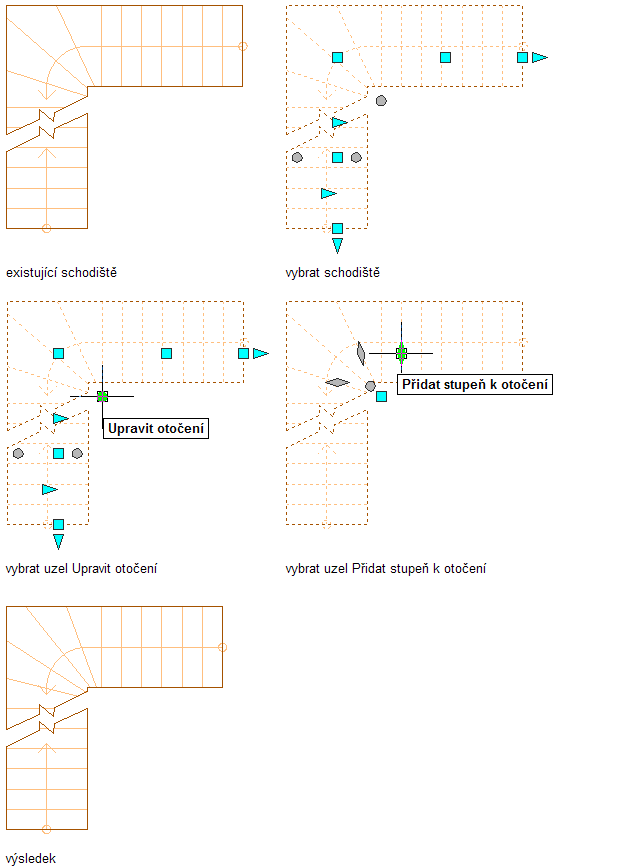 Poznámka: K získání bodu zúžení na hraně schodiště musíte vymazat nastavení Použít čáry podstupnice.