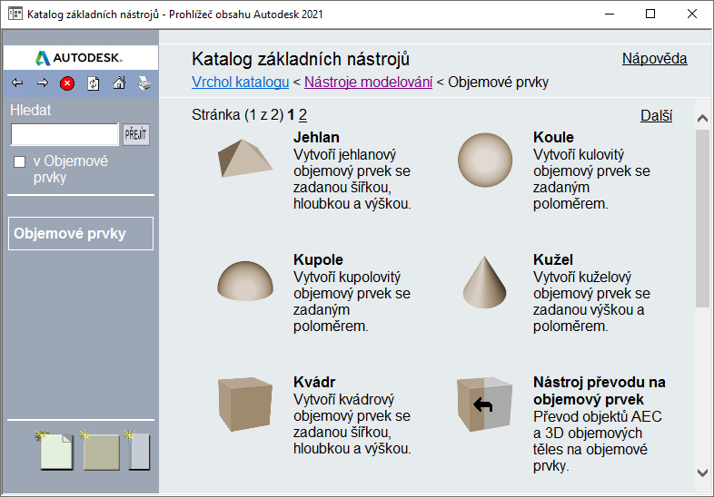 Kategorie katalogů nástrojů může obsahovat více položek, které se vejdou na stránku. Pokud je potřeba více stránek, zobrazí se na horní a spodní části každé stránky navigační ovladače. Kategorie Nástroje objemových prvků ukázaná dříve vyžaduje dvě stránky k zobrazení jejího obsahu. Je možné specifikovat stránku k zobrazení kliknutím na číslo stránky nebo kliknutím na tlačítko Další nebo Zpět. (Poznamenejme, že se tyto ovladače zobrazují ve spodní části stránky také.) Je také možné změnit počet položek, které se zobrazují na stránce Prohlížeče obsahu.
