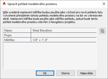 Poznámka: Pokud změníte vlastnosti pohledu modelového prostoru, nebudou aktualizovány instance tohoto pohledu, které byly vloženy jako pohledy listu do listu. Nové nastavení budou mít pouze nové instance pohledu modelového prostoru. Pokud je například definován pohled modelového prostoru pojmenovaný Západní schodiště s měřítkem 1/8” = 1’-0”, bude s tímto měřítkem vložen do listu. Pokud se list později změní na hodnotu 1/4“= 1’-0“, nebude nové měřítko v existujících pohledech listu aktualizováno, ale bude použito pro nové pohledy listu.
