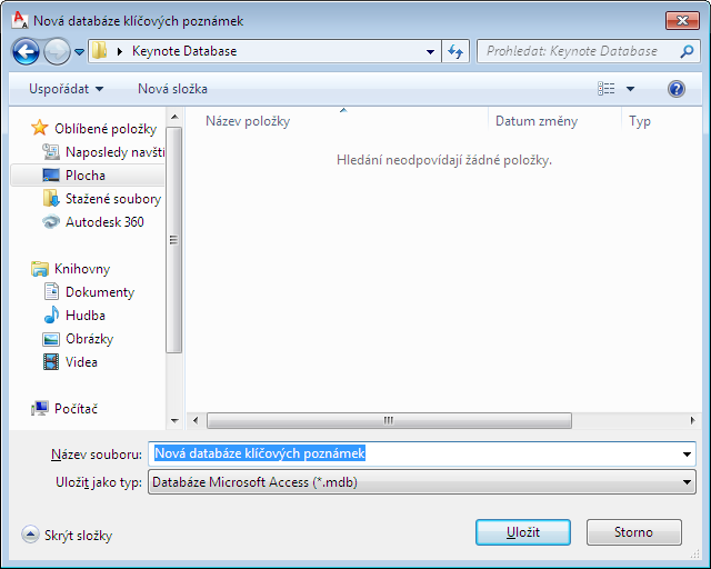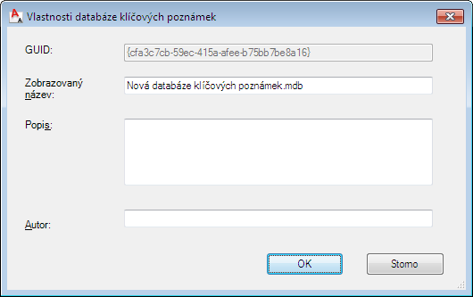 Bude vytvořena prázdná databáze aplikace Microsoft Access se všemi požadovanými tabulkami a dotazy pro ukládání a načítání klíčových poznámek. Nová databáze má globální jednoznačný identifikátor, který se zobrazí v poli GUID a v Editoru klíčových poznámek jako kořenový uzel s názvem, který jste zadali.