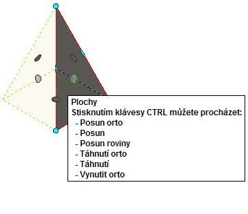 | Ortogonální vytažení nebo zatlačení plochy při současném přidání přilehlých ploch nebo vytvoření otvoru | klikněte a držte uzel Plocha, stiskněte pětkrát klávesu Ctrl a určete nové umístění plochy. | Nastavte plochu ortogonálně, přidejte přilehlé plochy, vytvořte, pokud je to možné, otvor |