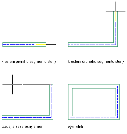 Tato možnost uzavře stěnu tak, že vytvoří segment stěny z posledního bodu zadaného pro stěny, do prvního bodu zadaného v této skupině stěn. Chcete-li při umísťování stěn využít tuto možnost, zadejte do příkazového řádku u (Uzavřít).