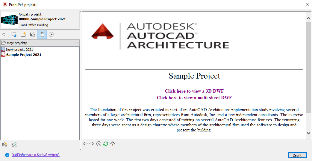 Prohlížeč projektu slouží k vytváření nových projektů, konfiguraci nastavení projektu a projektových norem, přidání detailních informací a výběru aktuálního projektu. Při nastavení projektu jako aktuální se z kontextové nabídky nebo dvojitým kliknutím na název souboru projekt převede do formátu kompatibilního s aktuální verzí Sada nástrojů AutoCAD Architecture 2027. Jestliže změníte také cesty projektu, převedou se i všechny soubory a nebude již možné otevřít projekt v jakékoliv starší verzi softwaru.